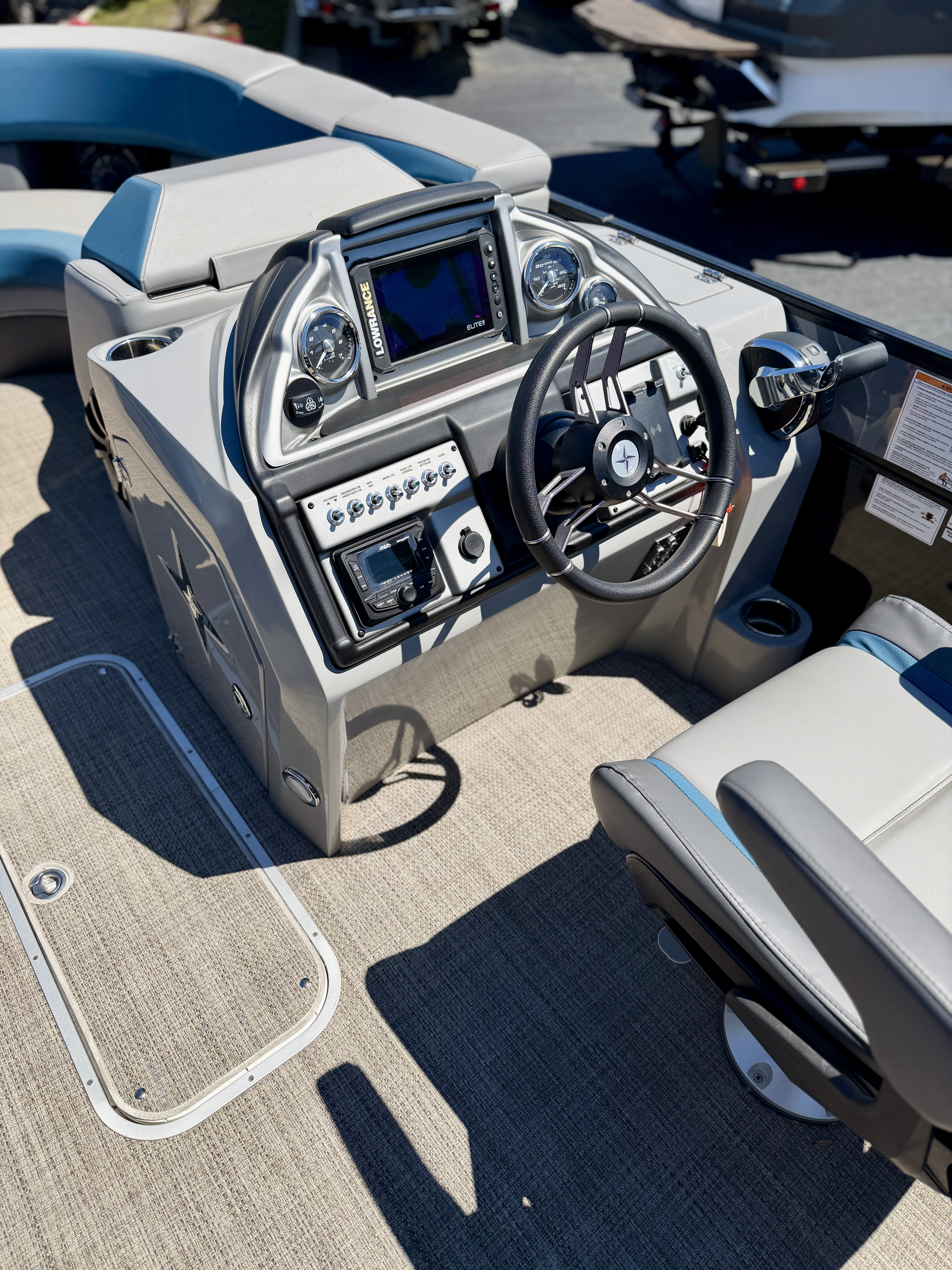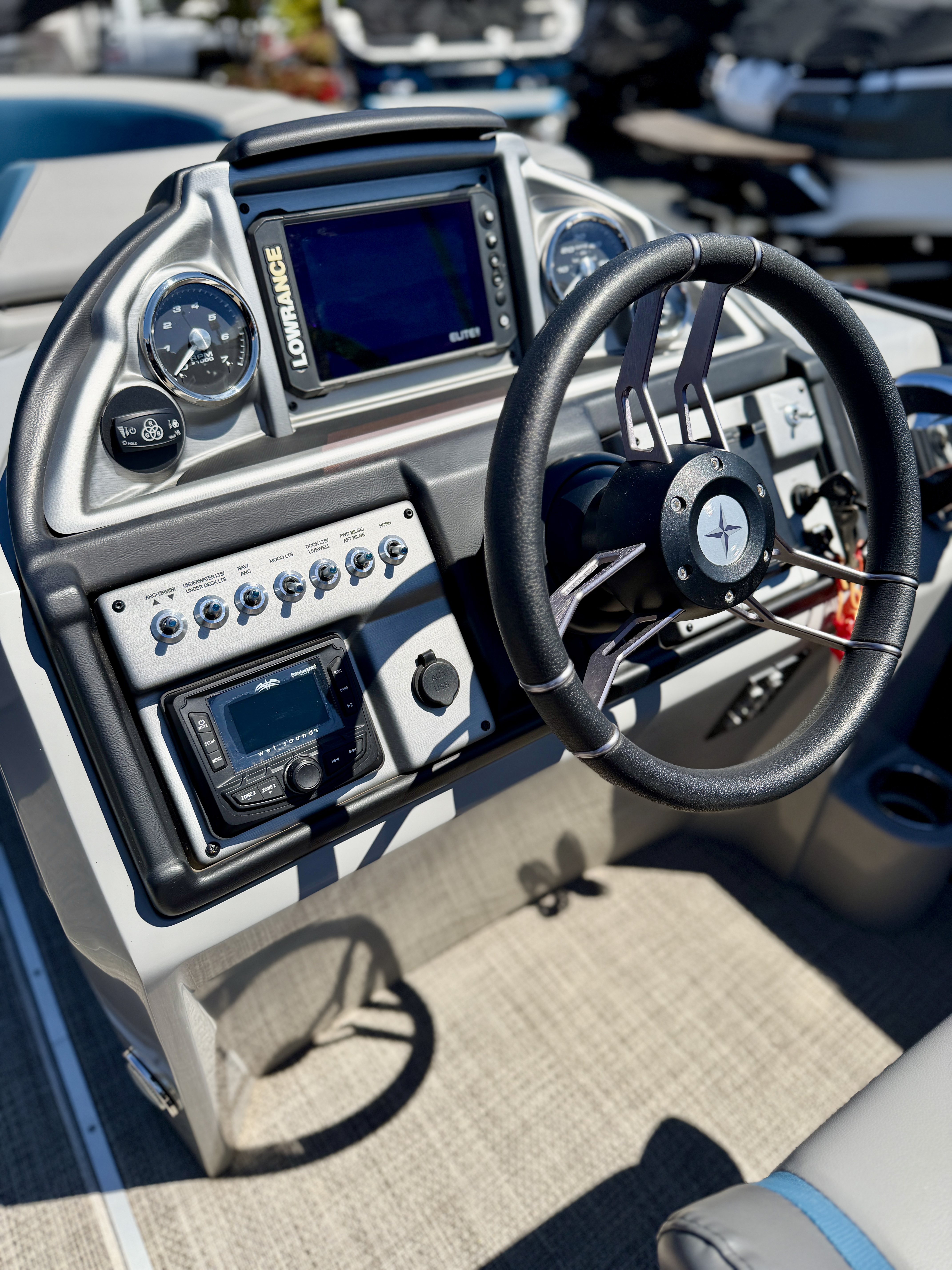 STANDARD FEATURES 4 165 Watt Lighted Speakers with Protective Inside Covers, 27 Gallon EPA Approved Fuel Tank in Motor Pod with Fuel and Water Separator, Three quarter inch one Piece V Lite Performance Deck with Bow Reinforcement Bumper, Aluminum Framed Mid Back Reclining Helm Chair with Arms and Headrest, Black Soft Grip Steering Wheel with Tilt Cable Steering, Deutsch Waterproof Electrical Trunk Wiring Harness, Extended Stern Vinyl Swim Platform with Stainless Steel Telescoping Ladder, Exterior D Rail Design on Full Rail Panels, Fire Extinguisher Housing, Helm Seat Slider Pedestal, LED Docking Lights in Front Rail Panels, Oval Shaped Silver Matte Table, Radius Deck with Integrated Deck Trim, Rub Rail and Aluminum Corner Pads, Raised Logos, Reinforced Splash Fins, Stainless Steel Cleats, Rail Braces and Cup Holders, Stainless Steel Ski Tow Bar and Port Side Cup Holder on RFX Models, Standard Analog Gauges including Trim, Tachometer and Speedometer, Surlast 10 foot Color Matched Bimini Top with Stainless Quick Release and Riser Bracket, Surlast Color Matched Playpen Cover, Teardrop Seat Cushions, Cupholder Cutouts, Transducer Brackets on both Port and Starboard Tubes, Wet Sounds Audio*Payments are at 7.99 Annual Percentage Rate for Customers with approved credit*
